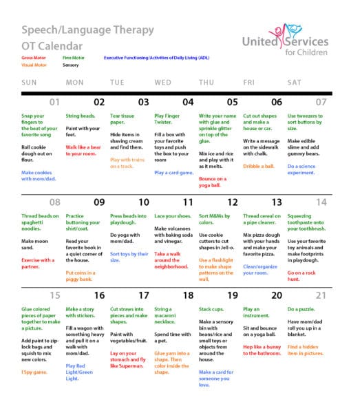 Here are ideas for daily Occupational Therapy activities to help your child continue to progress until in-person sessions resume. Click on the calendar image to download PDF version.